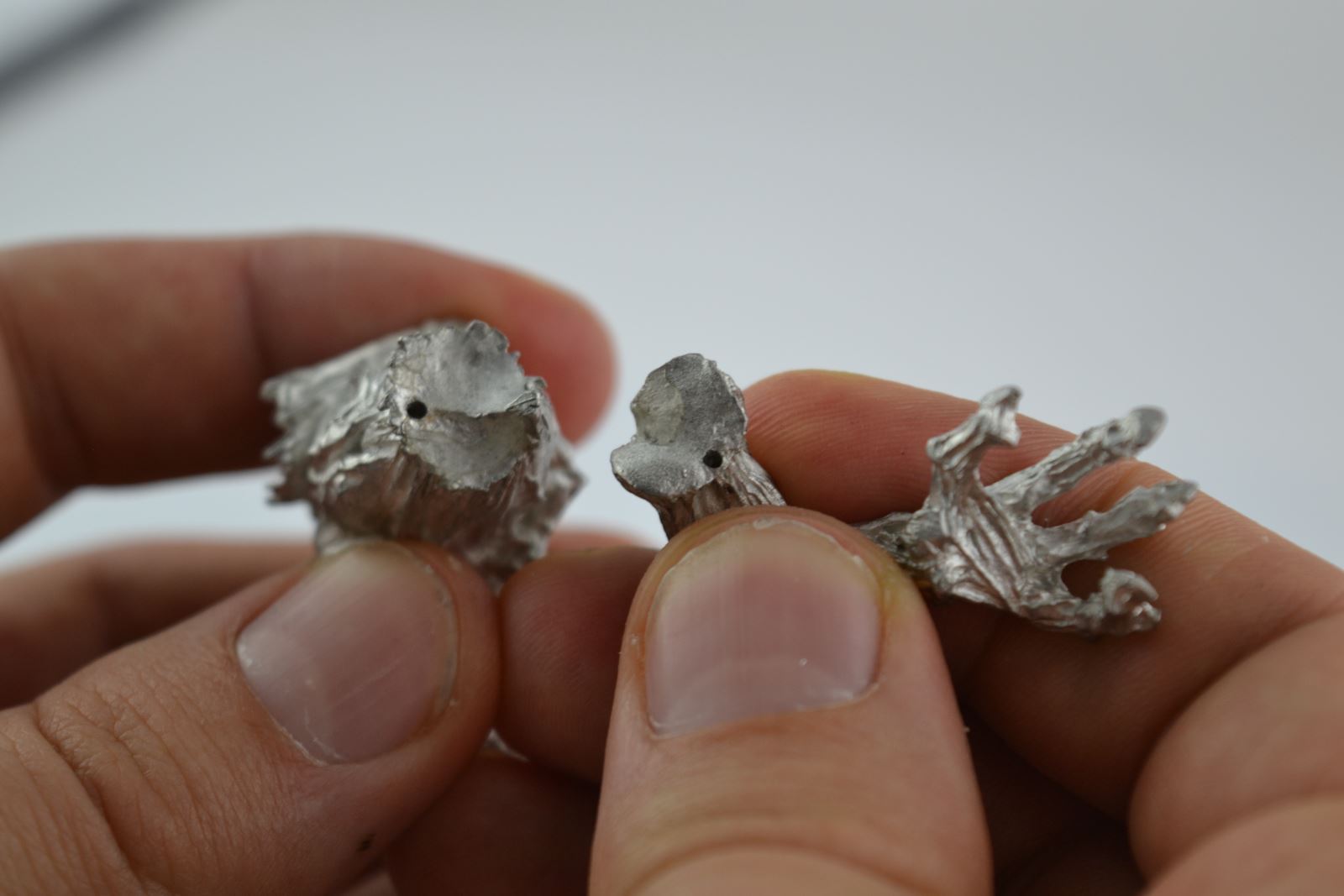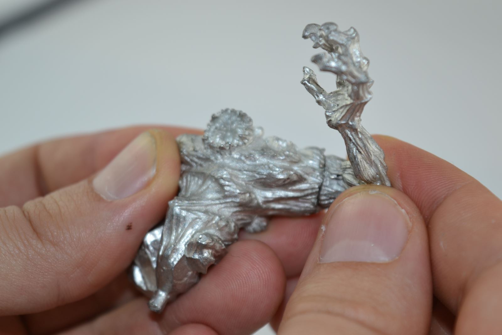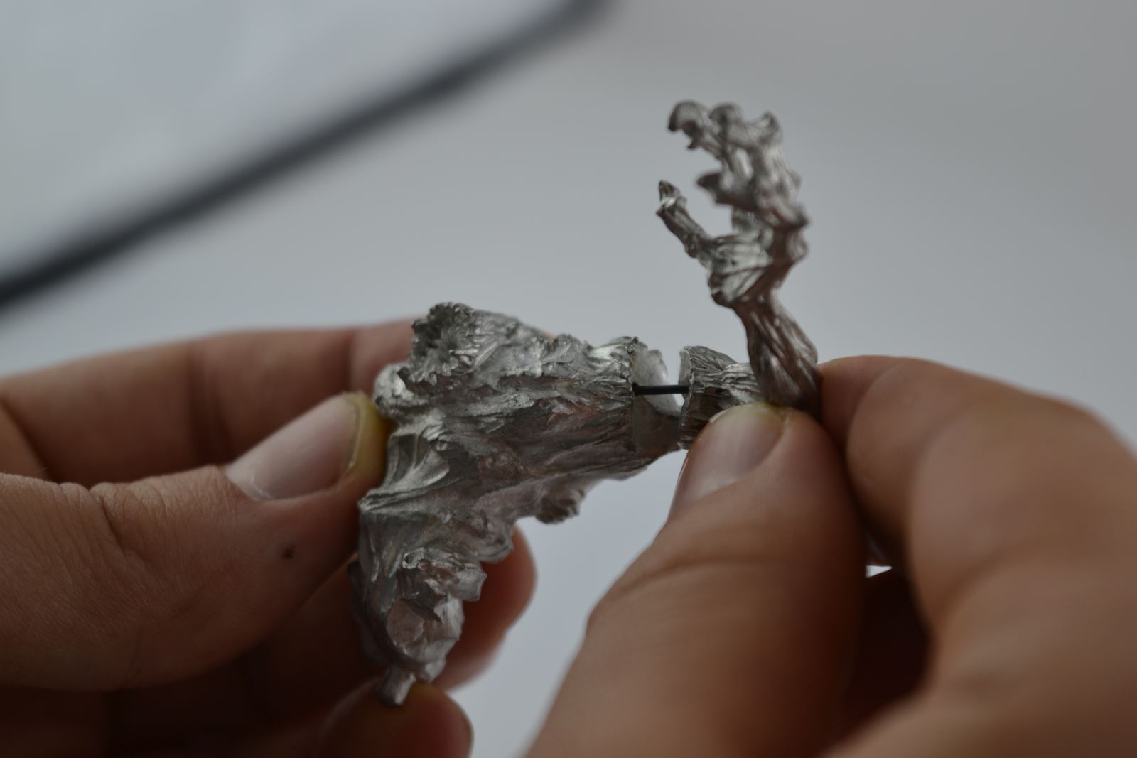 When you’ve worked out where to drill, keep the arm holding the miniature propped against your table or workspace and start drilling with the other hand. Most metal miniatures these days are made of pewter; though you’ll need to apply pressure to get make some headway, the material’s still soft enough to get the results you want. When you’ve drilled the first hole, move onto the second. Making sure both holes are lined up is essential for a good fit, so just check the location before drilling. What I usually do is slowly put the two pieces together and try to eyeball where the metal rod will go, then drill there. A method that has worked for other people (not shown here) is to put a piece of wire in the first hole and put a blob of paint at the end. Then try to put the other piece on top and you’ll end up with a small bit of paint on it, indicating where the hole should go. I’ve found this too inconvenient in the past, but it might work for you.