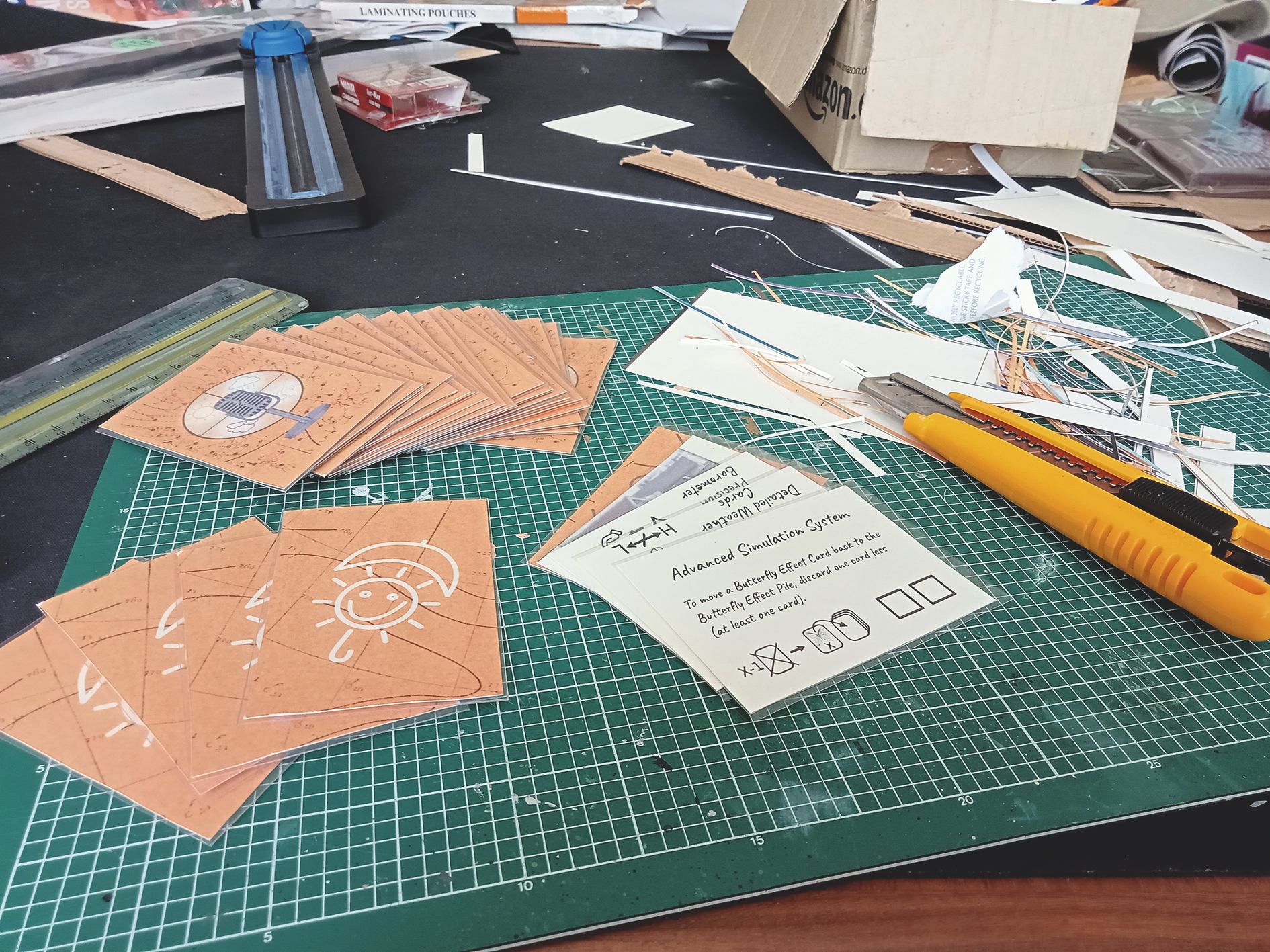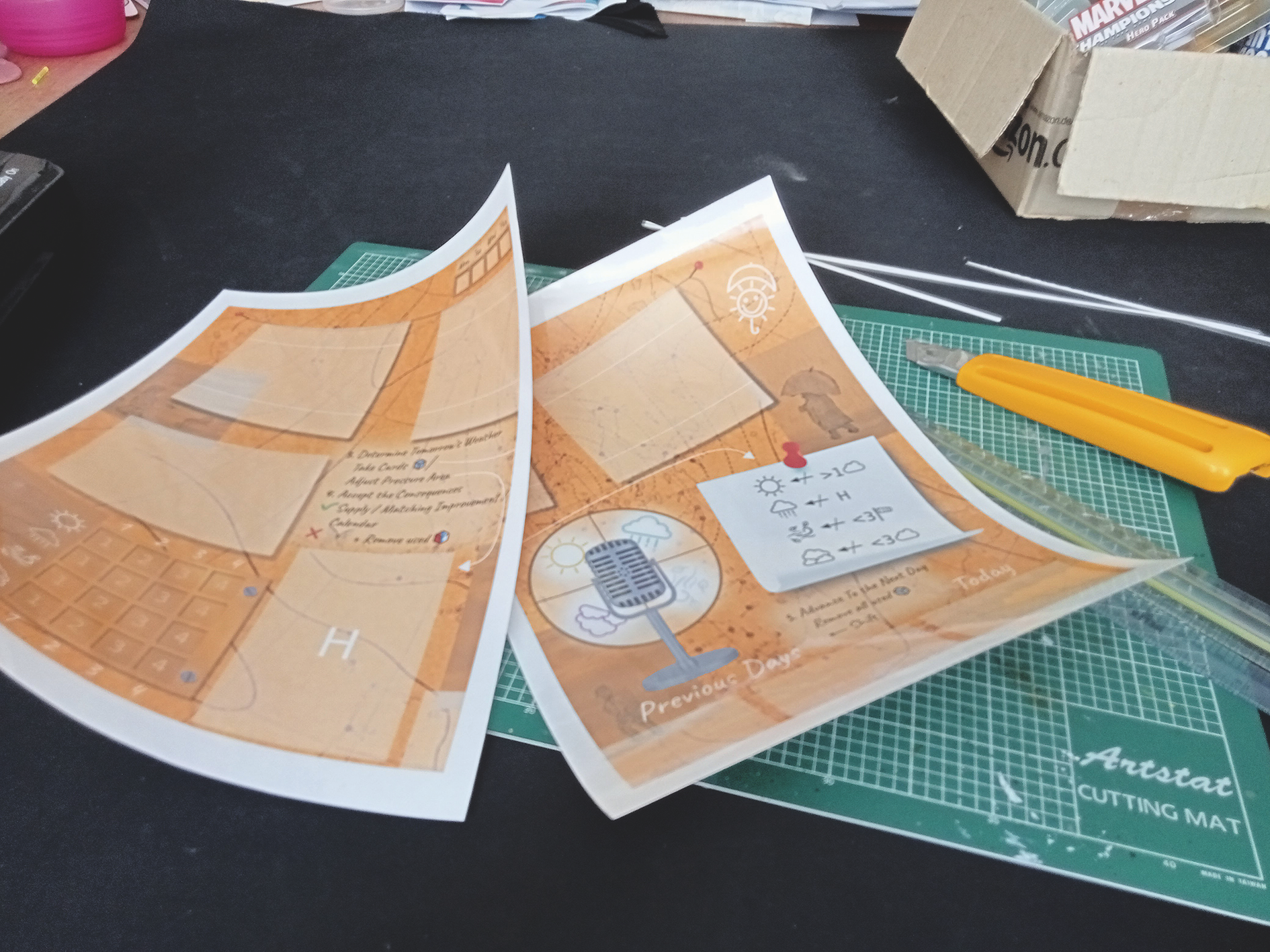 The board design was printed onto two separate A4 pieces of paper. I laminated them back-to-back, so that I could cut the edge of the laminate – separating them so that they would only be laminated on one side. This means each half of the board design has a paper side more suitable for gluing to the cardboard backing.