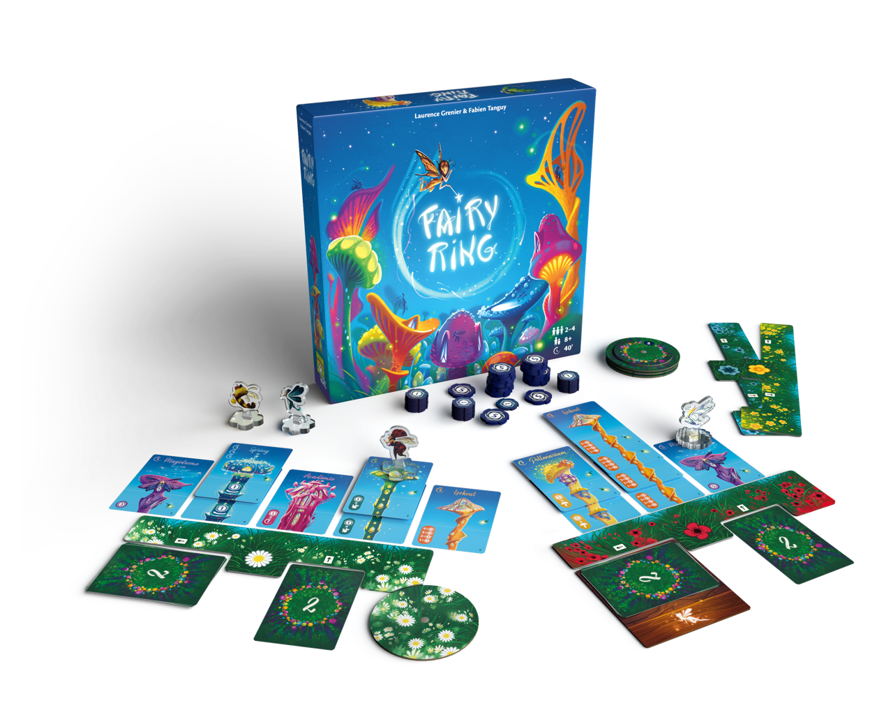Is this an intense player-vs-player battle? No, absolutely not, but nor does it feel so random that players lack agency either. Fairy Ring offers a light-weight mix of planning and surprises that my family and I found charming. It doesn’t hurt that the artwork by Maud Chalmel is bright and lovely, with well-designed plastic flower point-tokens and transparent Fairy standees. Aside from the pieces that you directly hold and interact with, the publishers have clearly made a real effort to avoid the unnecessary use of plastic, with paper bags, boards and trays. Good work!