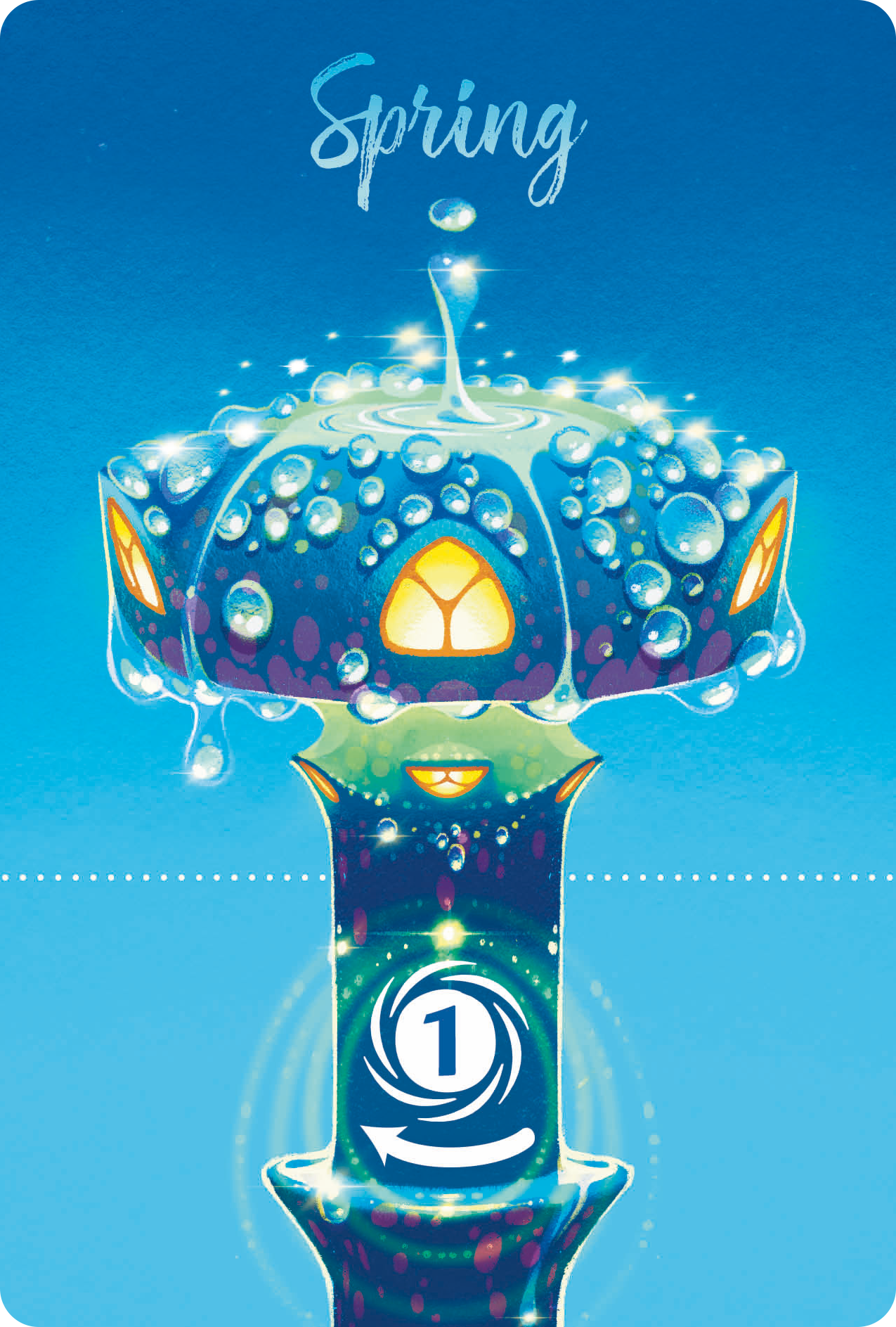 Each of the cards you place down has a different colour of mushroom, with different point-scoring mechanics. The purple “Magidrome” mushrooms have a simple point score every time they are landed on, whilst the pink “Academy” toadstools gain points based on how many spaces a Fairy moved before they arrive. The blue “Spring” shrooms are particularly interesting; they don’t score points for their owners if a fairy lands on them, but they do if one jumps over them. This has the effect of creating a “safe” space in the middle of an opponent’s row to land on without adding to their score.